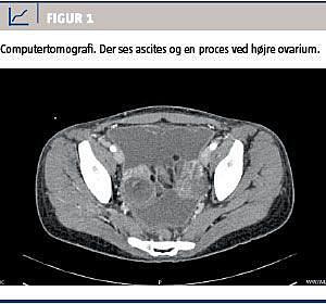 Ved en objektiv undersøgelse fandt man abdomen meteoristisk, øm under højre kurvatur og i højre flanke, men ikke peritoneal. Temperaturen var 36,9 °C målt rektalt. Biokemisk fandt man et C-reaktivt protein-niveau på 68 mg/l (referenceværdi: < 10 mg/l) og et hæmoglobinniveau på 6,5 mmol/l (referenceværdi: 7,1-9,3 mmol/l). En røntgenoversigt over abdomen viste tyndtarmsmeteorisme. Ved ultralydskanning (ULS) af abdomen fandt man en del ascites. En gynækologisk undersøgelse viste normale forhold, mens transvaginal ULS gav mistanke om en proces i højre ovarium, da dette var 5 × 4 × 5 cm stort, inhomogent og med cystiske forandringer. Patienten fik foretaget ultralydvejledt ascitespunktur, og der blev i alt udtømt fem liter gullig klar ascites, som blev sendt til cytologisk undersøgelse. Der blev målt en CA-125-koncentration på 150 kU/l (referenceværdi: < 35 kU/l). Patienten fik foretaget computertomografi af abdomen, hvorved man fandt patologisk forstørrede lymfeknuder i retroperitoneum, fortsat ascites, karcinoselignende forandringer i højre flanke og en cystisk proces i højre ovarium (Figur 1). Det gav betydelig mistanke om malign ovariesygdom.
