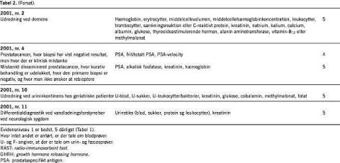 Tyve (37%) af klaringsrapporterne indeholdt anbefalinger vedrørende diagnostisk anvendelse af specifikke klinisk-biokemiske undersøgelser. De 20 klaringsrapporter indeholdt i alt 36 sådanne anbefalinger. Disse 36 anbefalinger, og de anførte evidensniveauer for den diagnostiske træfsikkerhed er anført i Tabel 2 . To af anbefalingerne hvilede på evidensniveau 1, tre på niveau 2, en på niveau 3, to på niveau 4 og 28 på niveau 5. Således var det anførte evidensniveau det lavest mulige for 78% af anbefalingerne.