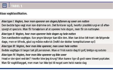 resultater: I alt 38 læger (59,4%) besvarede spørgeskemaet. De fleste kirurger 60,5% (23/38) foretrak Alaa vagttype I, hvor man opererer om dagen/aftenen og sover om natten.