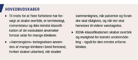 De vaskulære anomalier (VA) klassificeres på baggrund af kriterier, der er opstillet af The International Society for the Study of Vascular Anomalies (ISSVA). VA kan differentieres ud fra anamnesen, den kliniske præsentation, anomaliens udvikling, resultater af immunhistokemiske undersøgelser og billeddiagnostiske fund [1, 2]. ISSVA-klassifikationen (først præsenteret i 1996 og senest revideret i 2014) er baseret på en opdeling af anomalierne i: 1) vaskulære tumorer og 2) vaskulære malformationer. Senest er der sket en yderligere differentiering for at inddrage ny viden om genetiske forhold ved tilføjelse af en tredje gruppe: provisionally unclassified vascular anomalies [3-6].