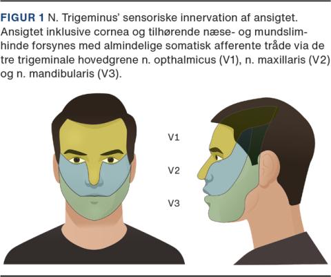 Den trigeminale sensibilitetsundersøgelse fokuseres på enten partiel eller total sansetab i det trigeminale innervationsområde (Figur 1). Man finder her hyppigst hypæstesi eller anæstesi, sjældnere allodyni/hyperalgesi. Alle sensibilitetsmodaliteter skal undersøges med tilhørende udstyr [8, 9].