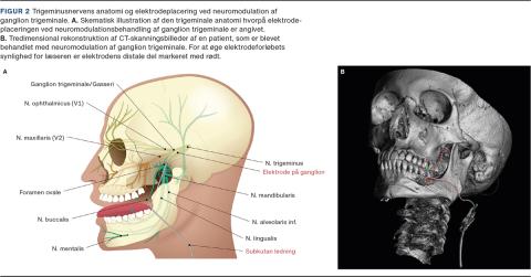 Neuromodulation udført ved anlæggelsen af en elektrode i nervegrenen, der forsyner det smertefulde område eller ganglion Gasseri, anvendes i tiltagende grad som behandlingsteknik til at erstatte TNO-smerter med mere acceptable paræstesier (Figur 2) [20, 24]. Metoden er endnu ikke testet i større randomiserede studier, men findes pga. sin reversibilitet og modulationspotentiale (den elektriske stimulation kan skrues op eller ned) mere tiltrækkende end ovenfor beskrevne neuroablative procedurer [21, 22].