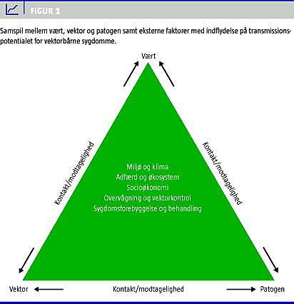 Klimaforandringer med stigende temperatur og vandstand samt ændrede nedbørsmønstre medfører -forståeligt bekymring for, om sygdomme, der især florerer i troperne og subtroperne, vil brede sig til tem-pererede egne, herunder til Danmark. Men også for at allerede etablerede sygdomme i tempererede egne vil opnå større udbredelse. Selv om mange såkaldte tropesygdomme snarere er betinget af fattigdom og uligheder i adgang til sundhed end egentlige tropiske forhold [1], så står det fast, at omgivelserne, herunder klimaet, kan have stor betydning for sygdomsmønstre. Det gælder ikke mindst for de vektorbårne sygdomme. Disse sygdomme involverer mindst tre organismer; et patogen, en vektor og en vært, der foruden deres indbyrdes samspil hver især påvirkes af en lang række eksterne faktorer, bl.a. temperatur, nedbør og luftfugtighed [2]. Færre og kortere frostperioder kan f.eks. betyde øget overlevelse, levetid og aktivitet for en række vektorer i tempererede områder samt invasion af nye arter. Samtidig indvirker især temperatur på patogeners udviklingshastighed i vektorer [3]. Selv om klimaforandringer således kan øge det biologiske potentiale for visse vektorbårne sygdomme, så er grundlaget for endemisk transmission betinget af, at vektoren opnår tilstrækkelig kontakt med inficerede såvel som modtagelige værter. Her spiller ikke mindst socioøkonomiske og samfundsmæssige forhold såsom kapacitet for vektorkontrol, sygdomsforebyggelse, overvågning og behandling en vigtig rolle (Figur 1 ).