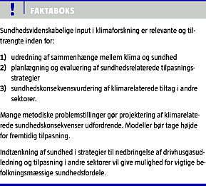 Sundhedsvidenskaben har vigtige bidrag at gøre til klimaforskning inden for udredning af sammenhænge mellem klimaændring og sundhed, identificering og vurdering af tilpasningsstrategier og sundhedskonsekvensvurdering af strategier for nedbringelse af drivhusgasudledning [1]. Her beskrives karakteristika ved de tre forskningsemner.