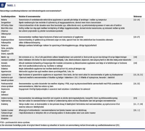 Oversvømmelser har hidtil været en hovedårsag til overdødelighed i forbindelse med katastrofer. I perioden 1980-2009 har oversvømmelser berørt 2,8 mia. mennesker, skabt 4,3 mio. hjemløse og medført 540.000 dødsfald [10]. Dødsårsagerne skyldes f.eks. drukning, fysiske traumer, forbrændinger, elektriske stød, bilulykker, både smitsomme og ikkesmitsomme sygdomme samt psykosociale problemer [11] såvel som ødelæggelser af infrastruktur og boliger. I Tabel 1 opsummeres eksempler på disse.
