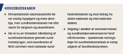 Klimaforandringer og klimavariabilitet er på en gang erklæret for at være de største trusler for human sundhed i det 21. århundrede [1, 2] og rummer ved målrettede indsatser samtidig nye muligheder for folkesundheden [2]. For at imødegå de mange klimarelaterede farer med potentiale for udvikling af regulære naturkatastrofer søger nationale myndigheder således i mange sektorer at gardere sig ved strategiudvikling, lovgivning og fremsættelse af regulativer og standarder. Disse skal medvirke til at minimere sundhedskonsekvenserne af naturkatastrofer og fremme sundhedsmulighederne. Internationalt har regeringer og organisationer etableret fælles rammebetingelser for tilgangen til katastrofehåndtering. Disse er formuleret i »Sendai framework for disaster risk reduction 2015-2030« [3]. For at sikre bedre koordinering af indsatser mellem internationale humanitære organisationer, der er aktive i håndtering af katastrofer, etableredes der i 2005 et fælles klyngesystem, som skal medvirke til mere effektiv og hurtigere respons og genopbygning [4]. Internationale katastrofeindsatser inden for sundhedssektoren koordi-