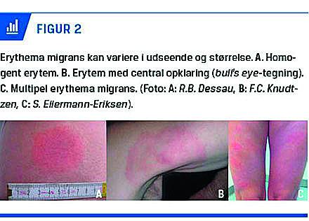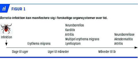 søger føde, så snart temperaturen er over 5 °C, og infektionen kan ses på alle tidspunkter af året. Kun et fåtal af flåtbiddene medfører dog borreliose. En svensk undersøgelse har vist, at kun omkring 2% af dem, der blev bidt af en B. burgdorferi-inficeret flåt fik klinisk borreliose, mens 6% serokonverterede. Asymptomatiske infektioner er således hyppige [6]. Mange flåtbid bliver ikke bemærket [7]. B. burgdorferi kan invadere forskellige typer af væv, danner ingen toksiner, men er kraftigt immunogen, hvorfor de kliniske manifestationer skyldes inflammation [8]. LB beskrives klassisk i tre stadier (Figur 1). Stadie 1, erythema migrans (EM), er et udslæt, som spreder sig lokaliseret i huden ud fra bidstedet (Figur 2). Spredning til andre organsystemer ses ved stadie 2, som er den tidlige infektion, og stadie 3, som er den sene infektion. Den sene form er defineret ved en varighed på over seks måneder. Denne inddeling er nok ikke en helt god beskrivelse, da der snarere er to typer af sygdomsforløb: de korterevarende infektioner (op til få måneder) og de sjældne længerevarende og progredierende sygdomsbilleder, hvor der ikke er tendens til spontan helbredelse. Stadie 2 og 3 betegnes ofte som dissemineret infektion, men de kliniske fund er oftest lokaliserede, som beskrevet nedenfor. Ved nye flåtbid er der risiko for reinfektion, også selvom patienterne kan have et vedvarende antistofrespons [9]. Der eksisterer p.t. ingen godkendte vacciner imod LB. I Danmark er EM og neuroborreliose (LNB) de to hyppigste sygdomsmanifestationer. For en mere udførlig gennemgang henvises der i øvrigt til den danske klaringsrapport fra 2014 [5].