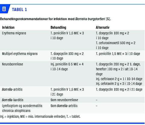 Behandling af EM består af peroral phenoxymethylpenicillin og bør påbegyndes alene på klinisk mistanke [23]. Formålet med behandlingen er at standse udbredelsen af erytemet og at forhindre yderligere progression af sygdommen. Ved klinisk mistanke om LNB og fund af pleocytose bør behandlingen iværksættes med det samme, og der skal ikke afventes svar på en intratekaltest. Ved LNB benyttes der antibiotika, der sikrer tilstrækkeligt høje koncentrationer i CNS, enten intravenøst givet benzylpenicillin, intravenøst givet ceftriaxon eller peroralt givet doxycyclin [24, 25]. Valg af behandling afhænger af patientens kliniske tilstand. Klinisk upåvirkede patienter kan behandles med peroralt givet doxycyklin. Intravenøs behandling er ikke mere effektiv og giver ikke hurtigere symptomlindring, end peroralt givet antibiotika ved europæisk LNB [25]. Borrelia-karditis behandles som LNB. Symptomatiske patienter bør indlægges til elektrokardiografisk monitorering og evt. få anlagt temporær pacemaker (indiceret hos ca. 30%). Se i øvrigt Tabel 1 for oversigt over behandling af LB.