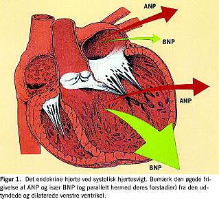 Hjertet kom med på listen over endokrine organer i 1981. Normalt secerneres de beslægtede hormoner atrial natriuretisk peptid (ANP) og brain natriuretisk peptid (BNP) fra hjertets forkamre. Ved sygdom i hjertekamrene øges dog hormongenernes ekspression i de ventrikulære myocytter drastisk. Plasmakoncentrationen af de natriuretiske peptid-hormoner og deres biosyntetiske forstadier (proANP og proBNP) bliver derfor et biokemisk mål for ventrikelfunktionen, hvor en øget plasmakoncentration primært reflekterer nedsat pumpefunktion (Figur 1 ). Denne erkendelse er løbet stærkt, hvor status i dag synes at være, at BNP og proBNP er de mest anvendelige analytter til diagnostik af hjertesvigt. Helt pålidelige målemetoder er dog først blevet tilgængelige i de seneste par år. På flere klinisk-biokemiske afdelinger i landet er man netop nu ved at indføre analyser for BNP eller proBNP. Med udbredelsen af hjertesygdomme er det endda sandsynligt, at natriuretiske peptidhormoner og deres forstadier vil blive de hyppigst målte peptider i den diagnostiske hverdag.
