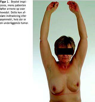 Undersøgelsen foretages i et veloplyst lokale, som er tilstrækkelig varmt til, at patienten uden fysisk ubehag kan undersøges med overkroppen afklædt. Undersøgelsen indledes med patienten siddende på en briks i opret stilling med armene ned langs siden og undersøgeren siddende lige overfor. Først foretages inspektion, hvor der noteres eventuel forskel i form og størrelse brysterne imellem. Der ses efter synlige forandringer på brysterne inklusive papil og areola i form af rødme, sårdannelse og retraktion af hud eller papil. Ved hudforandringer noteres, om der foreligger temperaturøgning. Man beder herefter patienten om at løfte armene op over hovedet (Figur1 ), og man iagttager, om der herved opstår asymmetriske formforandringer eller retraktion som tegn på en underliggende tumor.