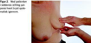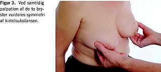 Palpation af brystet påbegyndes med patienten siddende. Selve palpationen foregår bimanuelt, idet man med en hånd over og en under brystet systematisk palperer brystvævet igennem (Figur 2 ). Symmetri kan vurderes ved samtidig palpation af de to bryster med hver sin hånd (Figur 3 ). Hvorvidt en tumor er fikseret til den underliggende muskulatur, kan vurderes ved at bevæge den i forskellige retninger henover brystvæggen, mens pectoralismusklen er spændt (Figur 4 ).