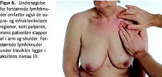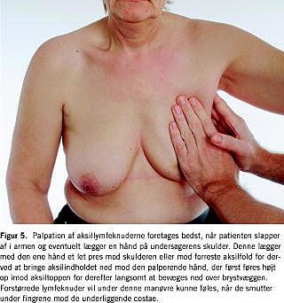 De regionale lymfeknudestationer aksillært, periklavikulært og på halsen undersøges også bedst med patienten i siddende stilling. Aksillen palperes bedst, når patienten har armen afslappet, eventuelt med en hånd på undersøgerens skulder (Figur 5 ). Det er normalt at kunne palpere små bløde lymfeknuder (LN), hvorimod hårde LN taler for metastaser. Ved fund af malignitetssuspekte LN vurderes det, om disse er fikserede til omgivelserne eller til hinanden som et konglo-merat. Fund af palpable LN periklavikulært eller på den nedre del af halsen taler stærkt for metastasering (Figur 6 ).