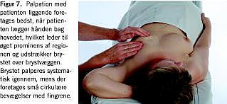 Herefter lader man patienten lægge sig på briksen, og brystet palperes igen systematisk igennem. For at udstrække brystet maksimalt over thoraxvæggen og dermed få så tyndt mammaparenkym som muligt at palpere lader man patienten placere hænderne skiftevis bag hovedet (Figur 7 ), evt. lægges en skråpude under thorax på den side, som skal palperes. Der palperes bedst med flad hånd, således at det primært er fingerpulpae på 2.-4. finger, der berører brystet. Fingrene flyttes hen over brystet, mens der foretages små cirkulære bevægelser.