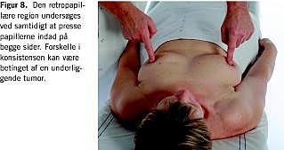 Lige under papillen er brystvævet mindre tæt, idet det her mest udgøres af udførselsgange. En tumor i dette område kan være vanskelig at palpere. Undersøgelsen afsluttes derfor med at undersøgeren samtidig presser papillen indad på begge sider for at vurdere, om der er lige »tomt« på begge sider (Figur 8 ).