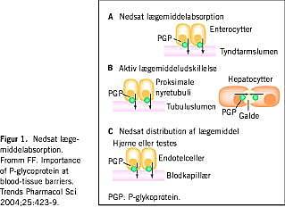 P-glykoprotein, som består af 1.280 aminosyrer, har tiltrukket sig stor interesse inden for klinisk farmakologi gennem de senere år. Oprindeligt blev dette protein opdaget i forbindelse med cancerkemoterapi, hvor det viste sig at være med til at forårsage udviklingen af tumorresistens for medikamentel behandling. Det har efterfølgende vist sig, at P-glykoprotein er fysiologisk udtrykt i mange af kroppens celler, men især lokalisationen luminalt i tarmepitel, nyretubuli og endotelceller i hjernens blodkapillærer er interessant i lægemiddelsammenhæng. P-glykoprotein fungerer som en effluxtransportpumpe, idet proteinet, under forbrug af energi, aktivt transporterer molekyler, som det genkender, herunder en lang række lægemidler, tilbage til lumen (Figur 1). Dette påvirker absorptionen og udskillelsen af visse lægemidler, hvilket er veldokumenteret for digoxin og cyklosporin. Lige nu er der fokus på betydningen for blod-hjerne-barrieren. Mange undersøgelser tyder på, at dette protein udgør en meget betydelig funktionel del af denne. For eksempel er mange antiretrovirale lægemidler substrater for P-glykoprotein. Dette kan være af en klinisk relevant betydning, idet penetransen til hjernen for en række antiretrovirale lægemidler er dårlig som følge heraf, og hiv i hjernen eksponeres dermed for lægemidlerne i væsentlig mindre omfang.