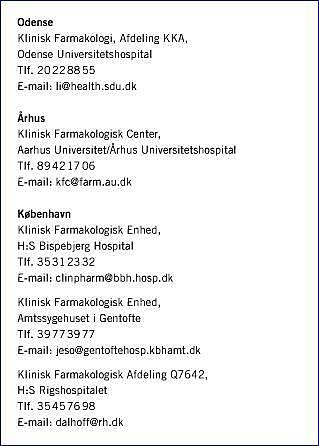 Ved klinisk farmakologisk rådgivning forstås en konsultativ service til klinisk arbejdende læger og andet sundhedspersonale med lægemiddelansvar. Rådgivningen tager udgangspunkt i en klinisk specifik problemstilling. I Danmark blev denne form for patientrelateret lægemiddelinformation sat i faste rammer i forbindelse med, at klinisk farmakologi blev indført som lægeligt speciale i 1996 [1]. Klinisk farmakologisk rådgivning udføres ofte i et tværfagligt samarbejde med farmaceuter og er udbredt i Europa, bl.a. i Sverige, hvor et netværk af klinisk farmakologiske lægemiddelrådgivninger har eksisteret i mange år [2]. I dag er der i Danmark fem enheder for klinisk farmakologisk rådgivning. I Århus og Odense er enhederne placeret ved klinisk farmakologiske centre, som er baseret på et samarbejde mellem universitet og universitetshospital. København er repræsenteret med tre enheder på henholdsvis Rigshospitalet, Bispebjerg Hospital og Amtssygehuset i Gentofte. Formålet er vederlagsfrit at forsyne læger med patientrelateret lægemiddelinformation, som er producentuafhængig og evidensbaseret. I lighed med i Sverige indgår de fem enheder i et netværk med registrering af (udvalgte) besvarelser i en fælles database, hvorved alle kan drage nytte af de akkumulerede svar. Telefonnumre og e-mail-adresser til de fem enheder er angivet i boksen.