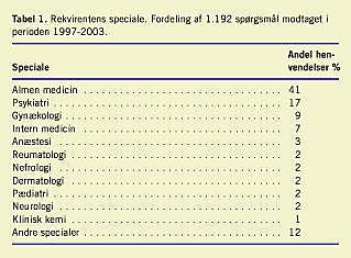 96% af spørgsmålene er stillet af læger. De resterende fire procent er stillet af andet sundhedspersonale, fortrinsvis farmaceuter, jordemødre og sygeplejersker. Ud over almen medicin er psykiatri, intern medicin og gynækologi de mest fremtrædende specialer (Tabel 1 ). Spørgsmål om bivirkninger og interaktioner er de dominerende inden for psykiatrien og den interne medicin, hvor de sammenlagt udgør henholdsvis 56% og 66%. Spørgsmål fra gynækologien omhandler for 90% vedkommende graviditet og amning. Spørgsmål fra de praktiserende læger svarer i store træk til totalfordelingen (Figur 1). 29% af rekvirenterne har henvendt sig mere end en gang til centralen. Flere mænd end kvinder henvender sig til centralen. De 41% af rekvirenterne, som er kvinder, har stået for 44% af henvendelserne.