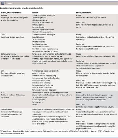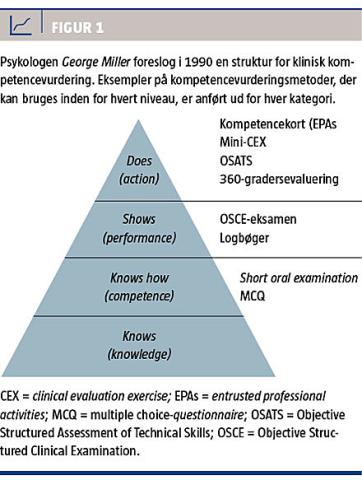 Millers pyramide er ofte anvendt til at illustrere, hvordan kompetencevurdering bør afstemmes med forskellige niveauer eller udtryk for kompetence – fra knows over knows how, shows how til does (Figur 1) [2]. Der findes mange forskellige kompetencevurderingsmetoder, der dækker over generelle såvel som specifikke redskaber. Således kan man bruge en Objective Structured Assessment of Technical Skills (OSATS) til specifik vurdering af kirurgiske færdigheder, en mini clinical evaluation exercise (CEX) til vurdering af håndteringen af en patientkonsultation eller en 360-gradersevaluering til en generel vurdering af en uddannelsessøgendes samarbejde med forskellige faggrupper [3].