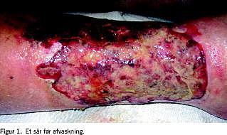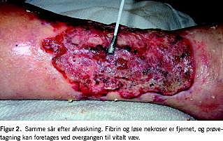 Sår: Overfladiske urenheder og sekret afvaskes med sterilt isoton NaCl-opløsning, der spules evt. med postevand af drikkevandskvalitet ved store, kroniske sår. Formålet er at fjerne fibrin og løse nekroser og komme ned til overgangszonen til det vitale væv, hvor en eventuel infektion findes [5] (Figur 1 og Figur 2 ). Derfor skal der biopteres fra sårranden så tæt på vitalt væv som muligt. I store, kroniske sår vil bakterietallet være monstrøst, ikke mindst ved igangværende infektion. Evt. tilførte bakterier fra skyllevandet vil i denne sammenhæng være af minimal betydning, både set i relation til vurdering af den mikrobiologiske prøve og sammenholdt med den gunstige mekaniske virkning af skylning med store mængder vand. Biopsimaterialet overføres til sterilt spidsglas, og 2-3 dråber sterilt isoton NaCl-opløsning tilsættes for at undgå udtørring.