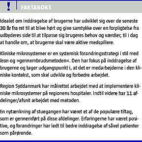 Brugerinddragelse har udviklet sig de seneste 30 år fra ret til at blive hørt og give samtykke over at tilpasse sig brugeres behov til i dag at lade brugerne være aktive medspillere. Kliniske mikrosystemer er en systemisk forandringsmodel, der har et særligt fokus på inddragelse af brugerne, og på at det er medarbejderne i klinikken, som skal udvikle og forbedre arbejdet. Region Syddanmark har arbejdet med implementering af kliniske mikrosystemer på regionens sygehuse. Indtil nu har 11 afdelinger/afsnit arbejdet med metoden. En nytænkning af stuegangen har været et af de populære tiltag. Erfaringerne har været positive, og forandringer har ledt til bedre inddragelse af såvel patienter som pårørende.