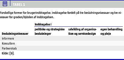 Øget brugerinddragelse bliver igen og igen fremhævet som en vigtig målsætning i sundhedsvæsenet i disse år. Forskning viser, at det kan lede til bedre komplians og mestring af egen sygdom [1], øge patienttilfredshed og motivation for behandling [2], samt øge patientsikkerheden [3]. Desuden stiller loven krav til inddragelse [4], og i pjecer og publikationer fra Danske Regioner og patientforeninger med flere nævnes idealet om brugerinddragelse jævnligt [5-8]. Alligevel er der en vis usikkerhed omkring, hvad der menes med begrebet. Med udgangspunkt i Tabel 1 vil vi her tegne et billede af forskellige former for brugerinddragelse og samtidig give et billede af udviklingen i forståelsen af begrebet.