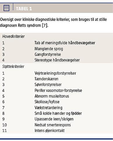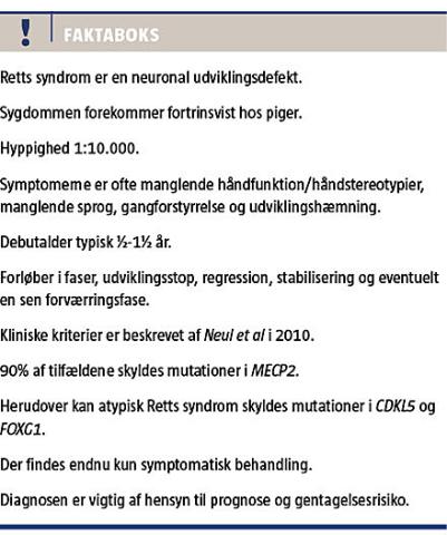 The neurodevelopmental disorder Rett syndrome was first described in 1966 by Andreas Rett, who described girls with loss of speech and hand use displaying characteristic hand stereotypies. Since then, the disease has been linked to muta­tions in the gene MECP2. However, the basis of the diagnosis is still clinical as defined by the latest clinical criteria as proposed by Neul and colleagues in 2010. This article presents a short clinical and molecular overview of the latest in Rett syndrome with emphasis on the Danish patients, headlines for making the diagnosis, differential diagnoses and molecular diagnostic possibilities.