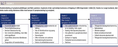 viser mindre interesse for leg og udvikler autistiske træk. Der registreres måske afvigende håndbevægelser, og hovedomfanget følger måske ikke udviklingskurven. Stadie to er karakteriseret ved en periode med regression, som kan vare uger til måneder. Barnet vil da være i alderen 1-4 år. I denne periode ses tab af tillærte psykomotoriske færdigheder. Sær-ligt håndfunktionen og sproget mistes. Der kan også tilkomme epilepsi, vejrtrækningsforstyrrelser og stereotypier. Vejrtrækningsforstyrrelserne ved Retts syndrom består i uregelmæssig vejrtrækning med hyperventilation og/eller vejrhold [11, 12]. Karakteris-