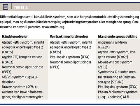 tionseftersporing i CDKL5 og FOXG1 overvejes. Endelig bør en række andre differentialdiagnoser overvejes. I Tabel 2 er vist en oversigt over differentialdiagnostiske forslag til klassisk Retts syndrom hos et barn med psykomotorisk udviklingshæmning og epilepsi, samt et af de tre mest karakteristiske symptomer, som normalt kan udløse mistanke om Retts syndrom. Disse er abnorme håndbevægelser, manglende sprogudvikling og vejrtrækningsforstyrrelser.