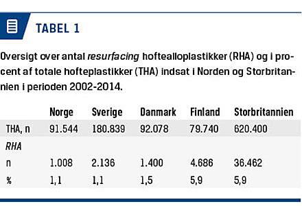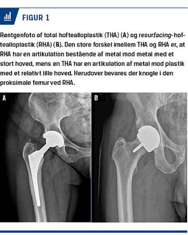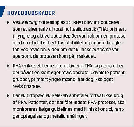 Det er nu mere end ti år siden, at resurfacing hoftealloplastik (RHA) blev introduceret i Danmark som et alternativ til total hoftealloplastik (THA). Målgruppen for RHA var yngre og mere aktive patienter, som især forventedes at kunne få gavn af større bevægelighed, bedre stabilitet og en bedre proteseoverlevelse, end man får med en standardhofteprotese [1].