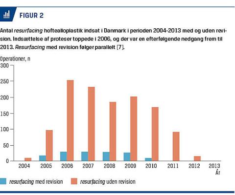 Der er indsat omkring en million MoM (RHA og THA) siden 2000 [6]. I perioden 2004-2014 er der registreret 1.400 RHA i Dansk Hoftealloplastik Register (Figur 2) [7]. Det udgør 1,5% af det samlede antal indsatte THA i perioden, hvilket er lidt højere end i Norge og Sverige (Tabel 1). I andre lande har andelen ligget væsentligt højere f.eks. 5,9% i Finland og Storbritannien. Den lave andel i Danmark og de øvrige skandinaviske lande skyldes en restriktiv holdning til indførelse af nye produkter herunder RHA på grund af usikkerhed om patient-outcome, bivirkninger og langtidsprognoser.