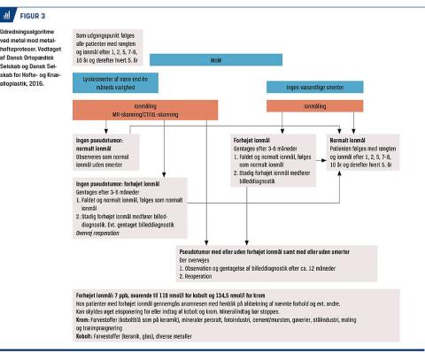 DOS anbefaler, at alle patienter, der har fået RHA- og andre MoM-hofter følges ambulant. Smerteanamnesen afgør den initiale udredningsmetode (Figur 3). Forhøjede ionværdier er en signifikant risikofaktor for tidlig revision af resurfacing proteser samt en indikator for slid af komponenterne [9]. Kon-stant forhøjede eller stigende ionværdier kræver nærmere udredning (typisk MR-skanning) og kan blive en indikation for revision. Ved fund af en pseudotumor med stor bløddels-