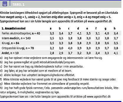 I Tabel 1 er de kvantitative spørgsmål til sammenligning af de uddannelsesgivende afdelinger, anført. Heraf fremgår det, at basislægernes tilfredshed med ansættelse i FAM ikke adskiller sig signifikant fra de øvrige KBU-lægers tilfredshed.