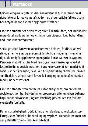 Viden om, hvorvidt forskelle i adgang til og brug af sundhedsvæsenets ydelser bidrager til social ulighed i helbred, er sparsom. I Danmark giver kombinationen af sociale registre og kliniske databaser unikke muligheder for at bidrage til denne forskning. Ved at koble de sociale registre med kliniske databaser kan vi analysere, om patienters sociale position har betydning for prognosen efter en given behandling i sundhedsvæsenet, og om livsstil og procedurer kan forklare eventuelle forskelle. En sådan undersøgelse er gennemført med udgangspunkt i Dansk Kolorektalcancer Database (DKD). Kolorektalcancer er med ca. 4.500 nydiagnosticerede tilfælde om året en forholdsvis almindelig kræftform - desværre med en relativt dårlig prognose. Behandlingen er fortrinsvis kirurgisk og 30-dages dødeligheden efter planlagt kirurgi er ca. 6% for radikalt opererede patienter. I 2001 etablerede Dansk Kirurgisk Selskab DKD for at overvåge, at behandlingen følger god klinisk praksis. DKD, som har været anvendt i flere forskningsprojekter, indeholder bl.a. oplysninger om patientens livsstil og perioperative forhold. I 2005 viste Nickelsen et al [9], at patienter som ryger, har en øget risiko for postoperative komplikationer og dårligere overlevelse. Det resultat øgede interessen for, om underliggende sociale faktorer har betydning for prognosen. I 2006 startede et ph.d.-projekt med det formål at undersøge sociale forskelle i dødeligheden blandt patienter med kolorektalcancer. Sociale data fra DST blev koblet med DKD, og resultaterne viste, at risikoen for at dø inden for 30 dage efter operationen reduceredes med stigende indkomst (odds ratio pr. 100.000 kroners stigning i indkomst (ORsi ) = 0,82(0,70-0,95)). En multivariabel analyse viste, at patienternes livsstil forklarede en del af forskellen, og sammen med komorbiditet forklarede det hele forskellen (ORsi = 0,91(0,79-1,05)). Oplysninger om sygdomsstadie og behandling så ikke ud til at forklare yderligere. Så der er social ulighed i dødelighed efter planlagt kolorektalcancer-kirurgi, som forskelle i behandling og sygdom ikke forklarer, men det gør patientfaktorer - især komorbidtet. Det vil også være interessant at analysere, om patienternes sociale position kan forklare de forskelle i 30-dages overlevelse, der er påvist mellem de kirurgiske afdelinger, og som kun delvis har kunnet forklares ved justering for køn, alder, tumorlokalisation og -stadie.