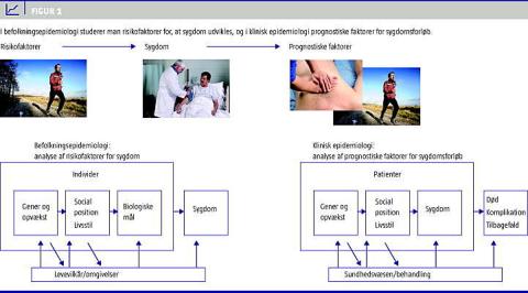 Viden om risikofaktorer for udvikling af sygdom og prognostiske faktorer, som har betydning for, hvordan sygdomme forløber, er vigtig for at kunne forebygge at sygdomme opstår og reducere negative effekter af disse. De fleste sygdomme opstår som et resultat af et samspil mellem risikofaktorer, der er knyttet til forhold i omgivelser og levevilkår, opvækst og genetik samt til individets livsstil og biologi. Tilsvarende er det et samspil af faktorer, der er relateret til sundhedsvæsenets tilbud og organisering, sygdommen sværhedsgrad og den givne behandling samt den enkelte patients livsstil og komorbiditet, som bevirker, at patienter med samme sygdom klarer sig forskelligt (Figur 1 ). Eksempelvis er der en række faktorer, som øger risikoen for at få blodprop i hjertet (alder, mand, tobaksrygning, lav social status, fysisk inaktivitet, forhøjet blodtryk, forhøjet serumkolesterol) og faktorer, som har betydning for sygdommens prognose (alder, kvinde, tobaksrygning, forvægsinfarkt, forhøjet blodtryk, medfødt hjertefejl, ventrikulær arytmi) [1].