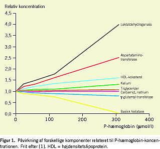 Hæmolyse er en velkendt fejlkilde, som påvirker mange biokemiske analyser, men i meget forskellig grad (Figur 1). De komponenter, som påvirkes mest, er således plasma (P)-laktatdehydrogenase og P-kalium i positiv retning og P-basisk fosfatase i negativ retning [2]. Hæmolyse fremkommer ved beskadigelse af erytrocytcellemembranen med efterfølgende frigivelse af hæmoglobin til plasma. Dette kan skyldes forskellige sygdomme (f.eks. HELLP-syndrom eller hæmolytisk uræmisk syndrom) eller fysisk beskadigelse af erytrocytterne (f.eks. mekaniske hjerteklapper eller dissemineret intravaskulær koagulation), men den kan også opstå i forbindelse med prøvetagningen, dvs. være en såkaldt præanalytisk fejlkilde.