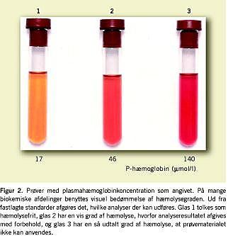 Blodprøvetagning ved venepunktur, fra katetre og fra kapsler udføres af mange forskellige personalegrupper, og bl.a. af denne grund er hæmolyse af blodprøver et hyppigt forekommende problem. Til eksempel er der rapporteret om påvirkning af op til 3,4% af plasmaprøverne til kaliummåling [4]. Specielt er problematikken udtalt i relation til prøvetagning i almen praksis [5]. Hæmolyse medfører ofte ny prøvetagning, hvilket i yderste konsekvens kan forsinke igangsættelse af den korrekte behandling og forlænge indlæggelsestiden. Det har længe været debatteret, hvordan hæmolyserede prøver bør håndteres: Hæmolysegraden bliver mange steder vurderet visuelt (Figur 2), og prøven bliver efterfølgende behandlet ud fra en fastlagt standard. Ny teknologi giver imidlertid mulighed for at udregne et hæmolyseindeks (HI) for prøven [6], og dette HI korrelerer til mængden af frit hæmoglobin i plasma (P-hæmoglobin). Ud fra det beregnede HI kan analysesvarene korrigeres med en faktor, hvilket dog ikke benyttes alle steder. Ved for højt HI er korrektion ikke mulig, og analyseresultatet tilbageholdes. Nogle laboratorier afviser helt at afgive analysesvar fra hæmolyserede prøver, mens atter andre afgiver alle svar korrigerede eller ukorrigerede i forhold til HI med eller uden en ledsagende kommentar [7]. Resultaterne fra undersøgelser har dog vist, at brugerne generelt har svært ved at forholde sig til disse kommenterede svar [8]. WHO har i 2002 anbefalet, at laboratorierne ikke afgiver kaliumsvar fra hæmolyserede prøver [9].