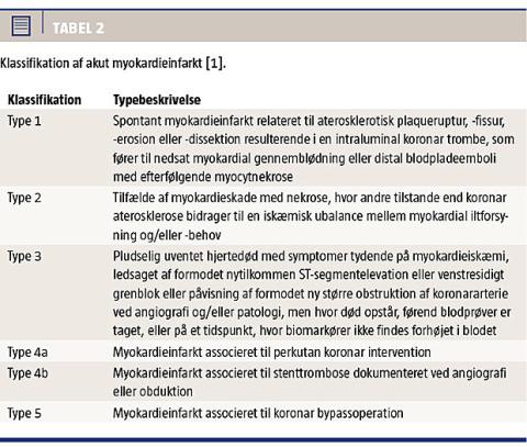Den patologiske definition på et AMI er hjertemuskelcelledød som følge af længerevarende myokardieiskæmi [1]. Diagnosen kræver derfor vished for tilstedeværelse af myokardienekrose samtidig med kliniske holdepunkter for myokardieiskæmi. Forhøjede cTn-værdier er tegn på myokardienekrose, mens evidensen for myokardieiskæmi baseres på symptomer, karakteristiske ekg-forandringer og evt. ekkokardiografiske ændringer (Tabel 1). AMI klassificeres i fem hovedtyper, hvor type 1 er det klassiske, spontane myokardieinfarkt, der oftest skyldes ruptur af et aterosklerotisk plaque med efterfølgende trombedannelse, mens type 2 skyldes en ubalance i myokardiet mellem iltbehov og -forsyning, f.eks. ved svær anæmi eller hypotension. Korrekt skelnen mellem type 1- og type 2-AMI kan være diagnostisk udfordrende og indebærer en omhyggelig klinisk vurdering. Den komplette klassifikation fremgår af Tabel 2 [1]. For at cTn-værdier kan tages som udtryk for myokardieskade, kræves en signifikant stigning og/eller et fald mellem mindst to målinger, som er taget med 3-6 timers mellemrum [11]. cTn-koncentrationen stiger typisk inden for to timer efter symptomdebut, topper inden for det første døgn og kan ved store infarkter være forhøjet i mere end to uger [1-3]. Ved en cTn-udgangsværdi tæt på 99-percentil-URL kræves en stigning på > 50% af det pågældende assay’s diskriminationsgrænse, mens der ved en udgangsværdi