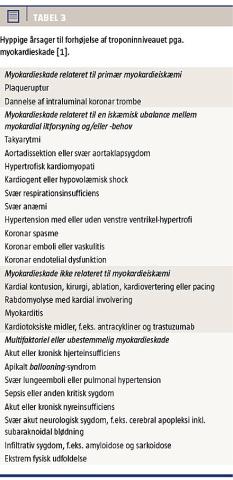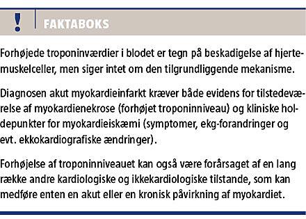 Troponinniveauets essentielle rolle i definitionen af et akut myokardieinfarkt (AMI) har ført til udvikling af troponin-assays med forbedret analytisk sensitivitet og større præcision, hvilket muliggør en tidlig og mere sikker diagnostik af patienter, som indlægges på mistanke om AMI [1-3]. Den naturlige konsekvens af den øgede sensitivitet er dog en reduceret specificitet, og derfor er det væsentligt at minde om, at en forhøjelse af troponinniveauet ikke er ensbetydende med et AMI, men er udtryk for en myokardieskade med nekrose af muskelceller [4-7]. På denne baggrund er formålet med denne statusartikel at belyse kliniske tilstande, som i hverdagen giver differentialdiagnostiske udfordringer pga. forhøjede troponinværdier.