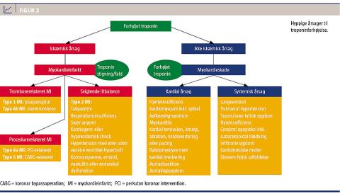 Selvom både cTnI og cTnT har en meget høj myokardiespecificitet, kan en forhøjet cTn-koncentration i blodet også være forårsaget af en lang række andre både kardiologiske og ikkekardiologiske tilstande, som enten kan være akutte eller kroniske (Tabel 3) (Figur 2). Anvendelsen af højsensitive cTn-assays og deres respektive 99-percentil-URL som diskriminationsgrænse har medført en betydelig stigning i antallet af patienter, som har fået påvist eleverede