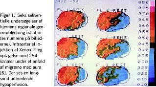 Undersøgelser af rCBF har ved migræne med aura vist en kortvarig hyperæmi efterfulgt af en længerevarende oligæmi, der spreder sig langsomt hen over cortex (2-3 mm/min) [6], Figur 1 . Udbredelseshastigheden svarer til hastigheden af cortical spreading depression (CSD), der blev beskrevet af Leao i 1944 [2]. I efterforløbet af CSD ses langvarig oligæmi hos rotter [2]. CSD er for nyligt observeret hos mennesker [15], og et CSD-lignende fænomen er visualiseret i synsbarken under en migræneaura med funktionel magnetisk resonans-billeddannelse (MRI) [2]. Med funktionel MRI er tidligere fund af occipital hypoperfusion under synsauraen bekræftet [2].