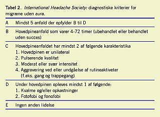 Hovedpinen er halvsidig, hemicrani, hos 60% af patienterne, mens resten har en bilateral hovedpine [2]. Hovedpinen er oftest fronto-temporal, og det er kun sjældent, at hele halvdelen af hovedet rammes [2]. Den er pulserende i 47-82% af migræneanfaldene [2]. Forværring af hovedpinen ved fysisk aktivitet ses hos 95% [2], og patienterne holder sig i ro under anfaldet. For diagnostiske kriterier for migræne uden aura, se Tabel 2 .