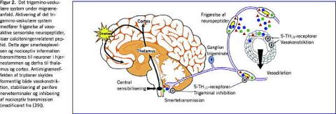 Arterier og n. trigeminus spiller formentlig sammen på en kompliceret måde ved udløsning af migrænehovedpinen, se Figur 2 . PET viser en aktivering i hjernestammen, der også er til stede efter succesfuld behandling, og som er specifik for migræne [2]. Man har talt om en så kaldt »migrænegenerator«, der måske initierer eller vedligeholder anfaldet.