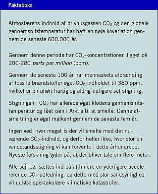 Den første og vigtigste indikator på, at vores klode står over for klimatiske ændringer, der er uden fortilfælde i menneskehedens historie, er det faktum, at CO2-indholdet i atmosfæren gennem de seneste 100 år, altså i den periode, hvor mennesket er begyndt at udlede CO2, er steget markant fra et i forvejen højt niveau på 280 ppm til i dag omkring 380 ppm. Det er en uhørt høj koncentration, som klimaforskerne allerede begyndte at advare om for ca. 20 år siden. Vi skal omkring fire millioner år tilbage i tiden, før vi sidst havde lignende høje CO2-koncentrationer. Dengang var havenes niveau omkring 20 m højere end i dag, og vintertemperaturen på den nordlige halvkugle var omkring 20 °C, altså markant højere end i dag.