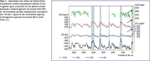 Symptomerne på jordens klimatiske problemer er ikke specifikke. Den globale gennemsnitstemperatur er ikke enkel at måle, den har svinget en del tilbage i tiden og fluktuerer som bekendt fra år til år. Denne lokale variation kan i nogen grad skygge for tendensen over et længere tidsrum. Gennem de seneste 600.000 år har varmeperioder og istider vekslet. Varmeperioderne har været af 10.000-25.000 års varighed med mellemliggende istider hver af 60.000-120.000 års varighed (Figur 1). Vi har i de seneste 15.000 år befundet os i en varmeperiode, som uden menneskets påvirkning skønnes at ville vare 5.000-10.000 år yderligere.