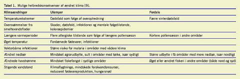 Den ubehandlede prognose for klodens klimasygdom er ganske urovækkende. En fortsat stigende udledning af drivhusgasser vil afstedkomme varmere klima globalt og vil medføre kraftigere nedbør i nogle områder med store oversvømmelser til følge, mens andre sydligere områder vil blive præget af udbredt tørke. Gletsjere vil smelte, og verdenshavene vil stige mærkbart allerede i løbet af en generation. Det vil indebære en spektakulær reduktion i millioner af menneskers velstand og velfærd. Alt dette vil også indebære massive risici for menneskers sundhed. Underernæring, sult, tørke, manglende rent drikkevand, oversvømmelser og sammenbrud i infrastrukturerne i en række lande vil alt sammen få umiddelbare følgevirkninger for den globale sundhed såvel som for politiske strukturer og sikkerhed (Tabel 1) [9].