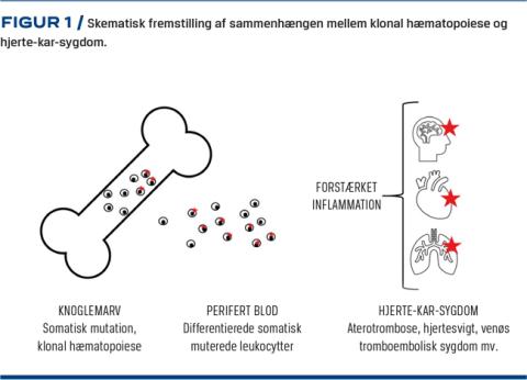 Alderen er den vigtigste risikofaktor for hjerte-kar-sygdom (HKS), hvilket ikke alene kan forklares af den med alderen ophobede eksponering for traditionelle risikofaktorer for HKS, f.eks. rygning, hypertension og hyperkolesterolæmi [1]. Aterosklerose, som er en kerneårsag til HKS, er en kronisk inflammatorisk sygdom, der er karakteriseret ved akkumulation af leukocytter (makrofager, lymfocytter, neutrofile granulocytter mv.) i arterievæggen, ligesom aldring ledsages af lavgraderet systemisk inflammation, der er en veldokumenteret risikofaktor for HKS og andre aldersrelaterede lidelser, f.eks. cancer og neurodegenerative sygdomme [2, 3]. Ud over en kumuleret byrde af f.eks. infektioner og miljømæssige påvirkninger kan mange andre faktorer bidrage til aldersbetinget inflammation, f.eks. epigenetiske forandringer, DNA-skade og oxidativt stress, men nærmere mekanismer bag relationen mellem aldring, inflammation og HKS er hidtil ikke blevet beskrevet. Nu tyder nye epidemiologiske og eksperimentelle data på, at aldersbetinget erhvervelse af somatiske mutationer i hæmatopoietiske stamceller med såkaldt klonal hæmatopoiese (KH) via aktivering af inflammatoriske mekanismer bidrager til aldersrelateret risiko for HKS (Figur 1) [4-6]. Denne nyopdagede risikofaktor for HKS har fået en del opmærksomhed, og det er fundet relevant at give en kort status på området.