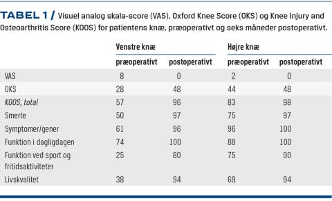 Resultaterne er opgjort i Tabel 1. Tabellen viser en oversigt over de forskellige scorer for begge knæ præoperativt og seks måneder postoperativt. For venstre knæ var der markant patientrapporteret forbedring af funktionen med total smertefrihed. Resultaterne fra højre knæ viste ligeledes fremgang, og postoperativt var knæleddet nærnormalt fungerende uden smerter. Dog var værdierne målt som udgangspunkt, og dermed funktionsniveauet, også markant højere end i venstre knæ.