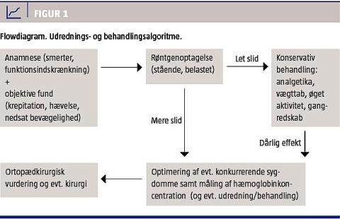 The diagnosis of arthrosis of the knee is based on anamnestic, clinical and radiological findings. Epidemiological Danish data are presented with a diagnostic algorithm. Treatment ranges from initially conservative – although with limited evidence of cost-benefit efficiency – towards surgical intervention. As opposed to dogma suggesting a delay of arthroplasty, early surgical intervention results in improved outcomes. Optimal treatment of co-morbidities and control of haemoglobin before referral to surgery optimizes patient outcome.