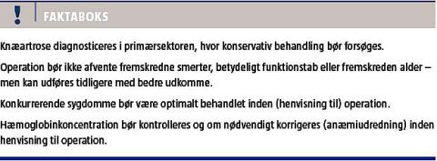 Behandlingen af knæartrose er multimodal og multidisciplinær og vil afhænge af, hvor fremskreden slidgigten er, og særligt hvor omfattende og invaliderende symptomerne er [8]. Behandlingen omfatter både konservativ og operativ behandling (Figur 1), således at konservativ behandling bør være forsøgt med suboptimalt udkomme, før operativ behandling iværksættes [9]. Dette følger anbefalingerne fra Dansk Ortopædkirurgisk Selskabs referenceprogram og fra Sundhedsstyrelsen [2] – om end der i et nyligt publiceret systematisk review blev konkluderet, at der kun er beskeden evidens for omkostningseffektivitet af konservativ behandling af slidgigt i knæ [10]. Der findes en lang række konservative behandlingstilbud – over 50 forskellige er identificeret, og effekten spænder fra ingen dokumenteret til nogen effekt [8] – disse behandlingstilbud omtales ikke detaljeret i denne artikel. Vægttab, øgning af fysisk aktivitetsniveau og analgetika er veldokumenterede konservative modaliteter med temporær eller varig – om end ikke kurativ – effekt [9]. Forekomsten af konkurrerende sygdomme, fysisk og psykisk habitus samt specifikke ønsker hos patienten kan sammen med lægens præferencer påvirke valget af behandlingsmodalitet. Såfremt de(n) valgte konservative behandlingsmodalitet(er) er udtømt(e) – hvilket primært bør forsøges i primærsektoren og reumatologisk regi – kan patienterne henvises til en ortopædkirurgisk afdeling mhp. evaluering af operative muligheder, forudsat at patienten har et ønske om mulig operation, hvilket bør afklares inden henvisning. Der bør foreligge røntgenoptagelse af knæet med belastning med patienten i stående stilling, evt. konkurrerende sygdomme bør være optimalt behandlet, og ideelt set bør der foreligge en hæmoglobinmåling med resultater i normalområdet – op mod 25% af patienter er præoperativt anæmiske, hvilket øger risikoen for et suboptimalt forløb og udkomme [11].