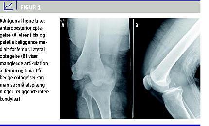 En 55-årig kvinde holdt stigen for sin mand under havearbejde. Manden mistede fodfæstet, faldt ned af stigen og landede ovenpå patientens højre knæ. Patienten fik straks stærke smerter i højre knæ, der også »sad underligt«. Patienten indbragtes af Falck med benet lejret på en bunke tæpper. Ved ankomsten konstaterede man en fejlstilling af højre knæ, denne tolkedes i første omgang som en patellaluksation. Ved palpation af knæet konstaterede man, at det var lukseret. De perifere neurovaskulære forhold fandtes -intakte, og patienten blev sendt til røntgenundersøgelse. Røntgen af højre knæ viste medial knæleds-luksation med en lille avulsion beliggende interkondylært (Figur 1 ). Patienten blev indlagt og fik i fuld anæstesi foretaget reposition af knæet. Ved undersøgelse i fuld anæstesi fandtes mistanke om læsion af det laterale kollaterale ligament (LCL), forreste korsbånd (ACL) og det bagerste korsbånd (PCL). Efter reposition var de perifere neurovaskulære forhold normale. Der blev anlagt en gipsskinne med knæet i 30°-fleksion. Arteria poplitea blev fulgt løbende for eventuel intimaskade. Næste dag blev patienten overflyttet til en afdeling, der er specialiseret i behandling af flerligamentskader. Der blev foretaget en magnetisk resonans-skanning, som viste ruptur af LCL og popliteussenen i det proksimale hæfte, total ruptur af ACL og PCL, partiel fascia lata-ruptur og partiel afrivning af det mediale kollaterale ligament proksimalt. Patienten fik 14 dage efter skaden indtraf foretaget rekonstruktion af ACL og PCL, LCL og popliteussenen blev reinsereret, og defekten i fascia lata blev sutureret. Postoperativt fik patienten anlagt en låst hængselbandage, som gradvist blev låst op. Patienten fik specialiseret genoptræning.